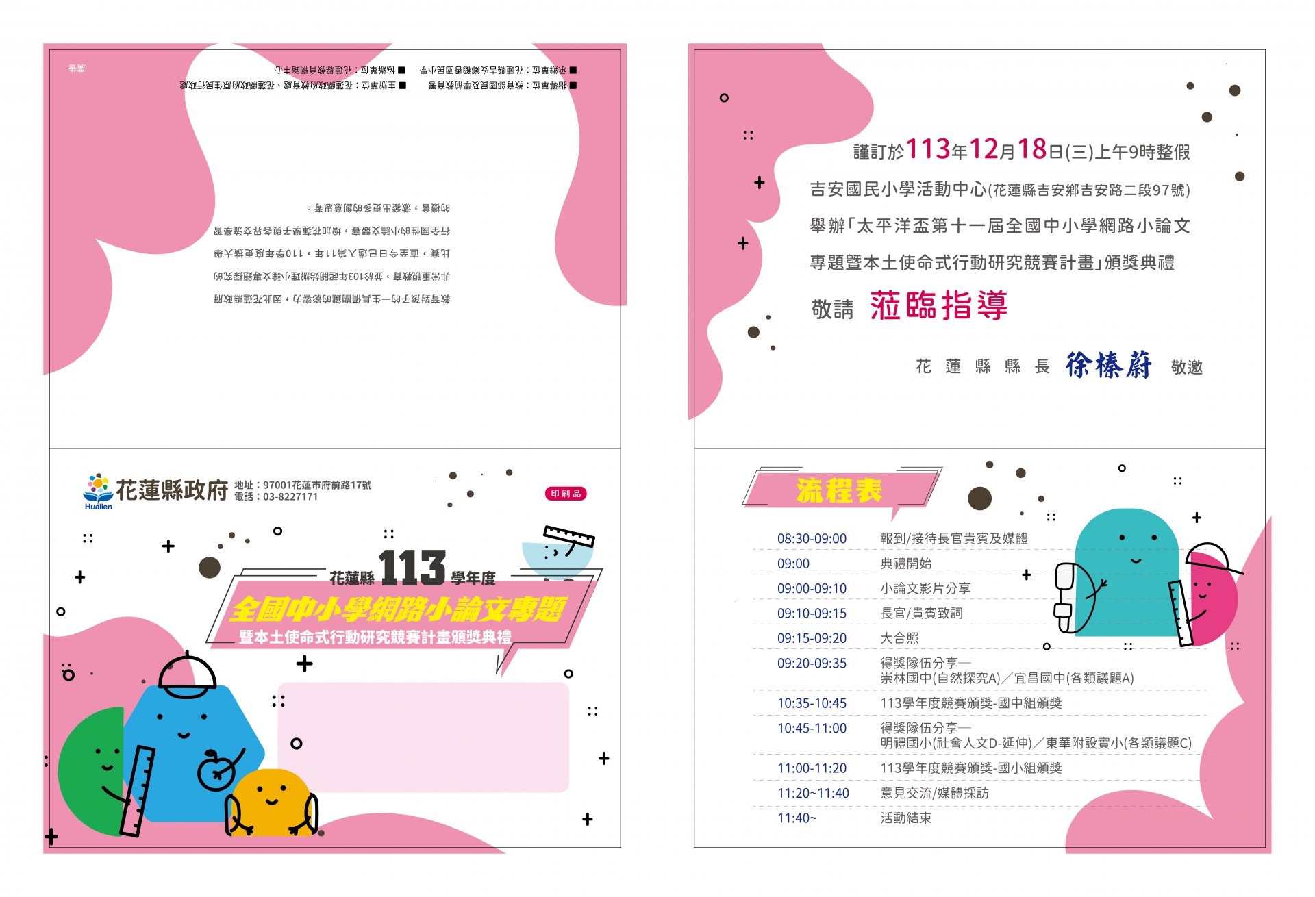 有關本府辦理「花蓮縣太平洋盃 113學年度第11屆全國中小學網路小論文專題暨本土使命式行動研究競賽頒獎典禮暨成果發表會」,惠請獲獎隊伍之學生及指導老師出席與會,並惠予公( 差)假登記,請查照。