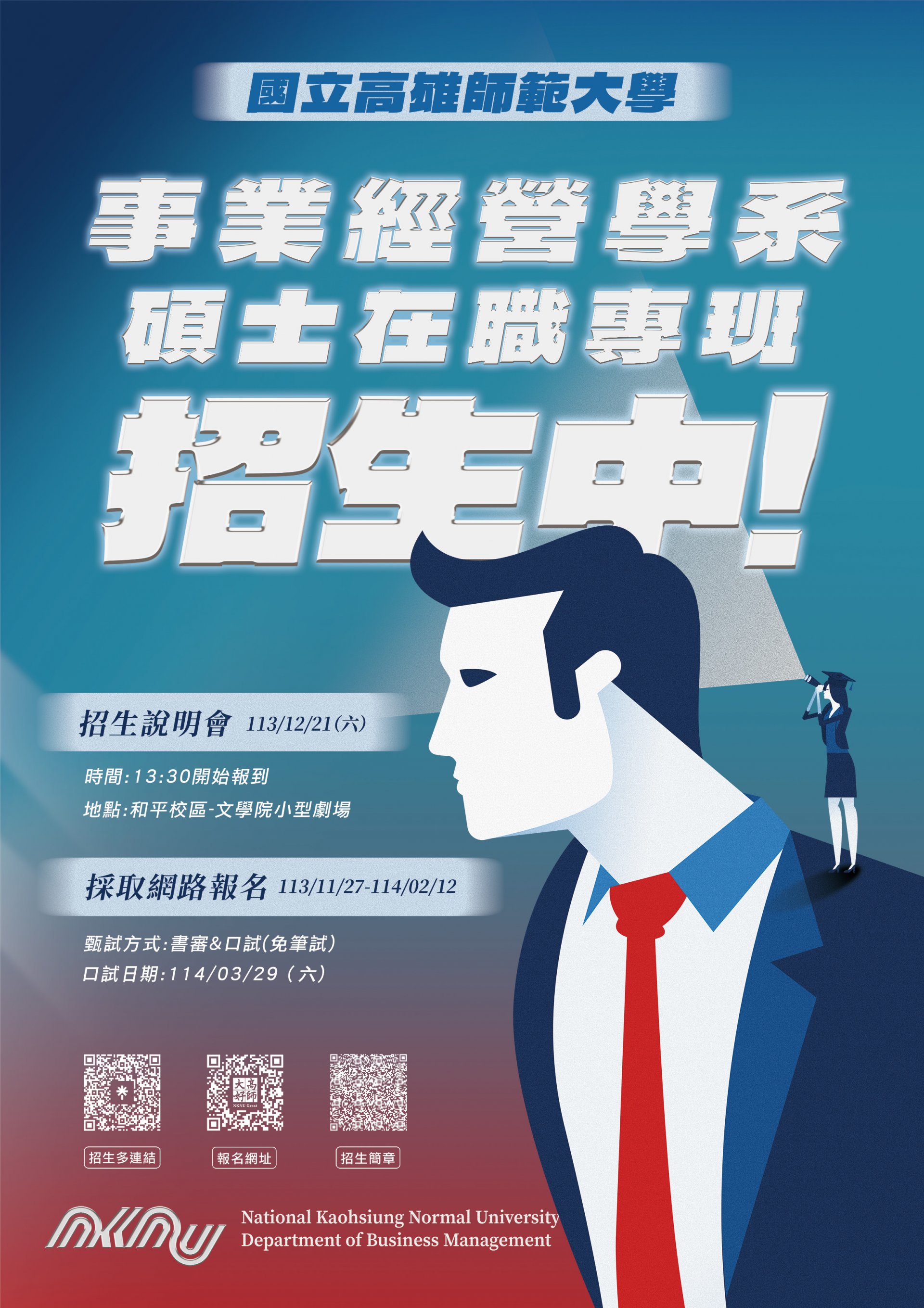 國立高雄師範大學114學年度「事業經營碩士在職專班」招生,敬請踴躍報考。
