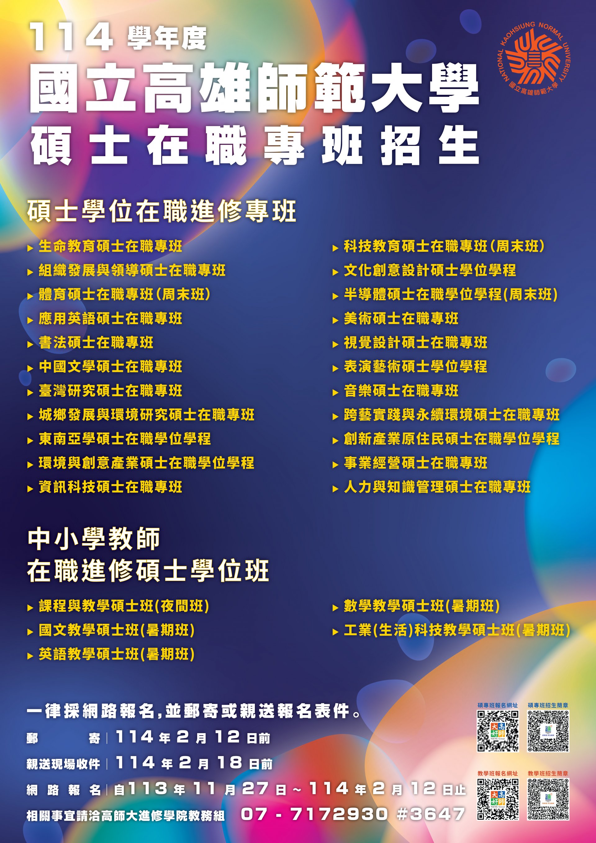 - 依據國立高雄師範大學 114 年 1 月 15 日高師大進字第 1141000330 號函辦理。