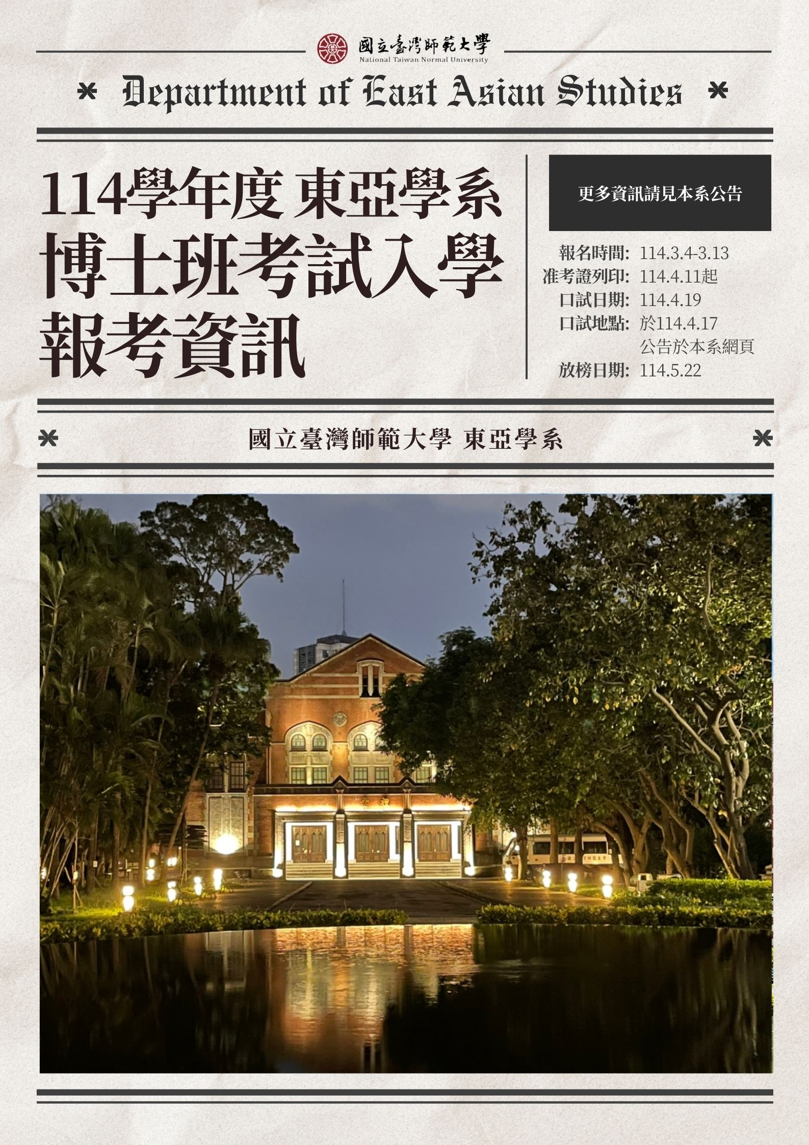 國立臺灣師範大學東亞學系博士班114學年度招生,敬請踴躍報考。