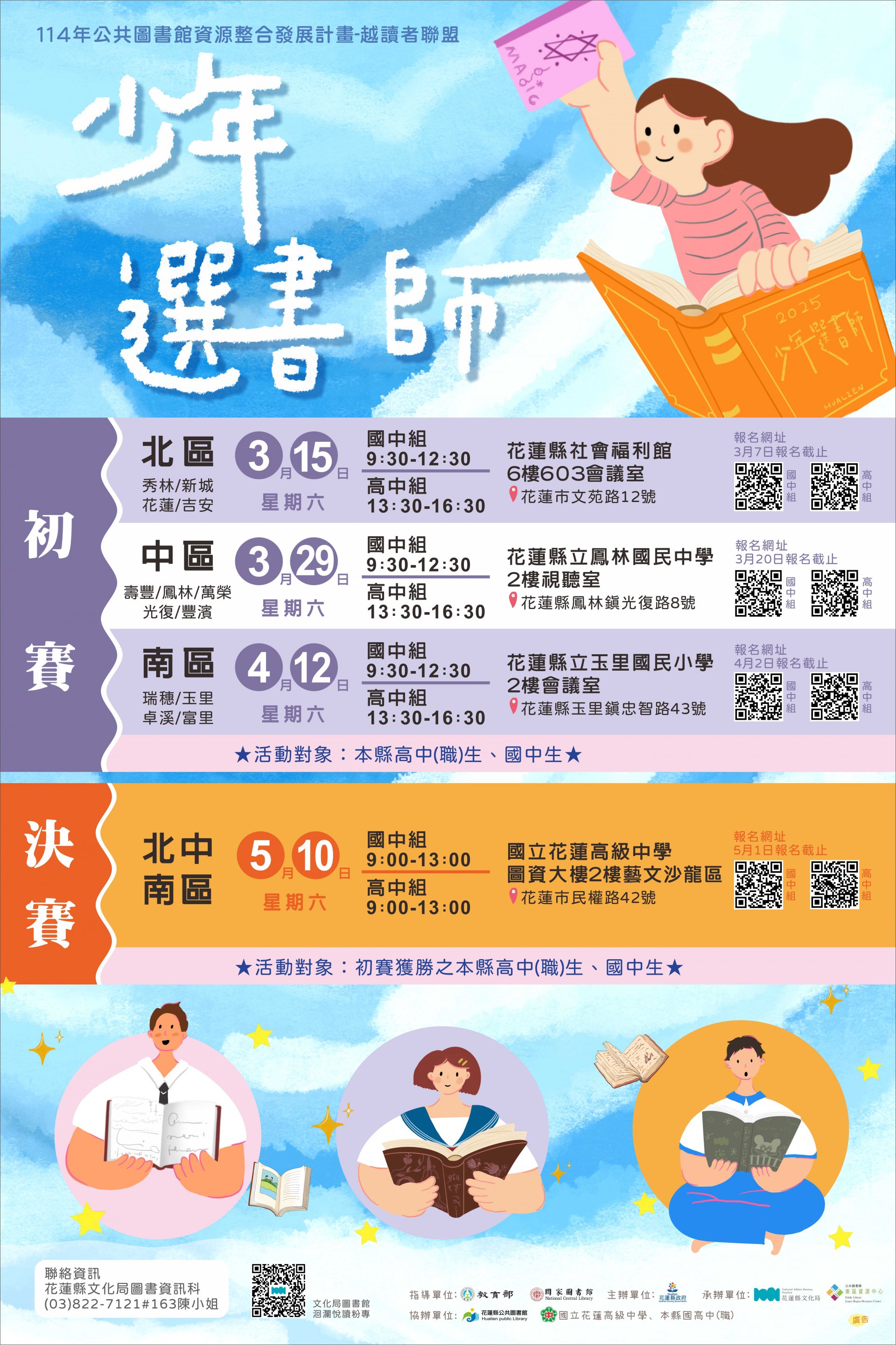 4、北中南區(決);國高中組:訂於114年5月10日(六) 上午9時至13時,假國立花蓮高級中學圖資大樓2樓藝 文沙龍區(花蓮市民權路42號)辦理。