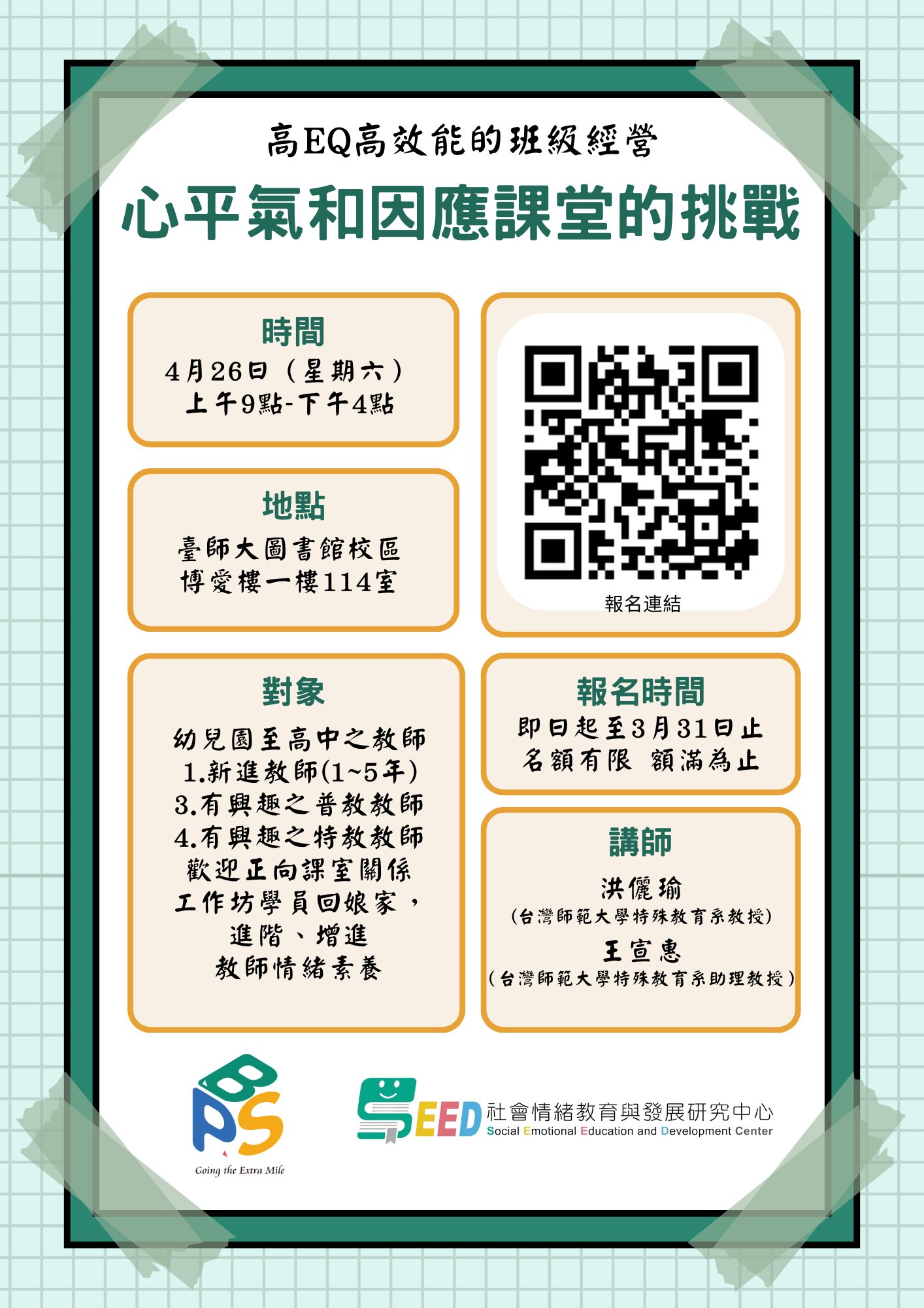 國立臺灣師範大學辦理「高EQ高效能的班級經營:心平氣和因應課堂的挑戰」,詳如說明,請各級學校新進教師踴躍報名參加,請查照。