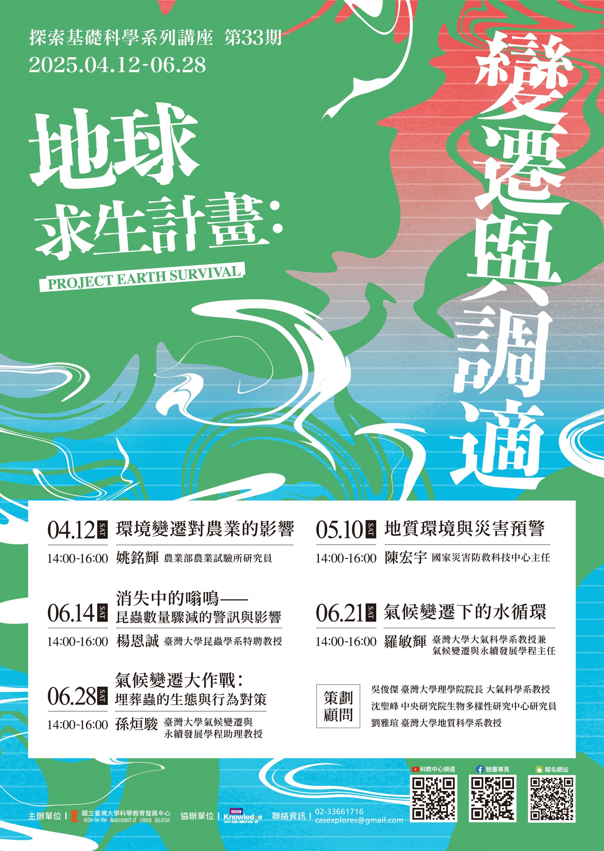 二、本期以環境變遷為主軸,邀請大氣、農業、防災及生物領域專家學者,以科學視角剖析環境變遷在不同面向的影響和考驗,並探討人類如何攜手應對。自 114 年 4 月 12 日至 6 月 28 日止,共辦理 5 場,場次及主題如下:(詳如附件)