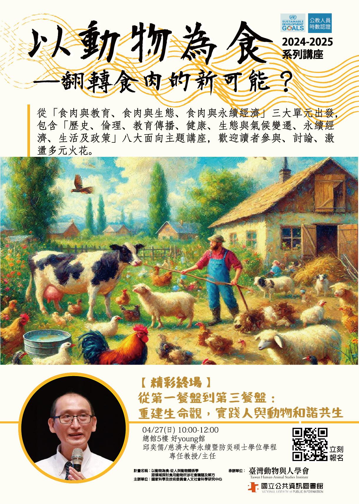 二、旨揭活動由該館與「臺灣動物與人學會」合辦,自 113 年 8 月起至 114 年 6 月止,就「以動物為食」主題邀請相關領域專家與教育者,與讀者共同參與、討論、激盪多元火花,為自己、家人及大眾未來可能遭遇的生活問題預想 因應;系列講座主題包括 SDGs 、食農、科普等相關內容,採實體講座及線上同步直播方式進行,並搭配線上及實體書展,每場介紹相關書籍。