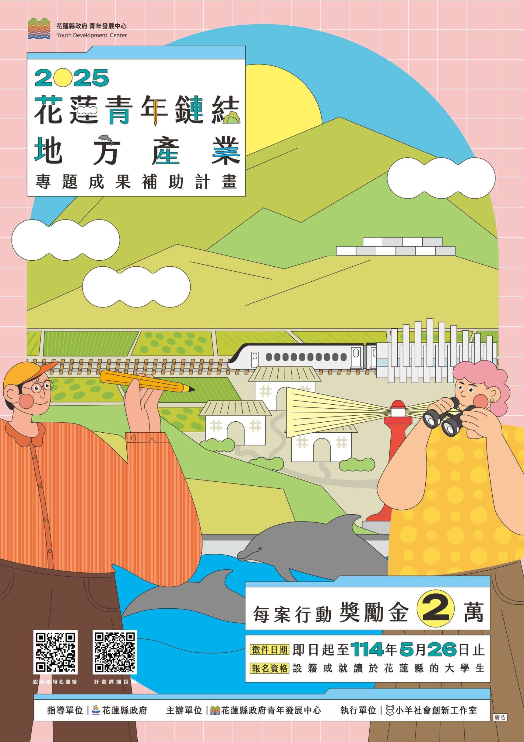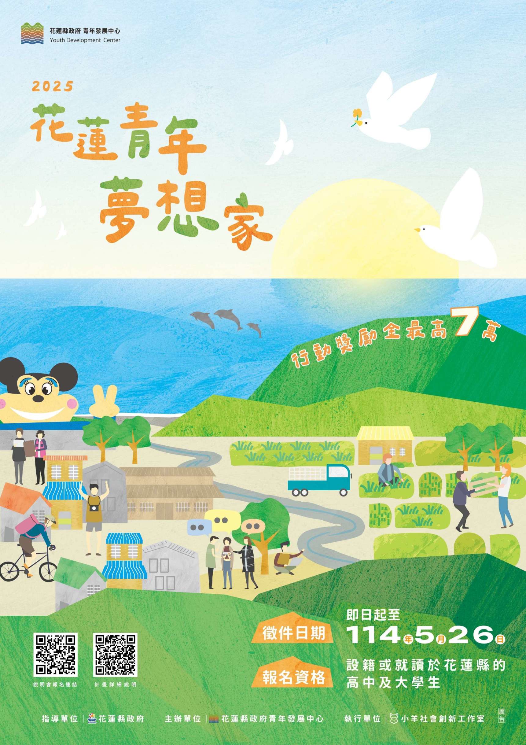 本府辦理「2025花蓮青年夢想家提案競賽」及「2025青年鏈結地方產業專題成果補助計畫」,敬請踴躍報名。
