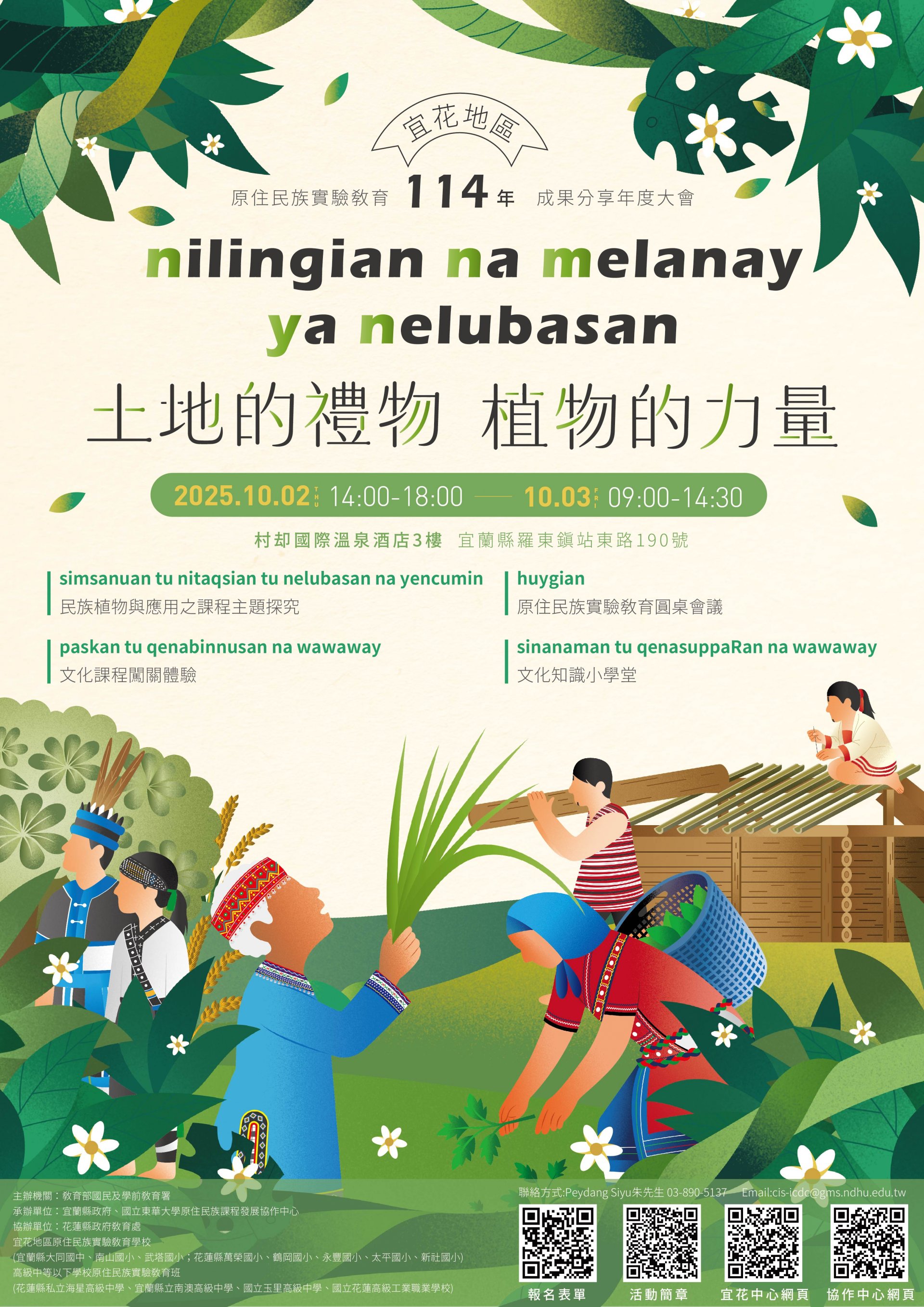 函轉國立東華大學原住民族課程發展協作中心辦理「nilingian na melanay ya nelubasan土地的禮物,植物的力量─114年宜花地區原住民族實驗教育成果分享」實施計畫書及活動海報乙份,請各校協助轉知並鼓勵所屬人員踴躍報名參加,請查照。