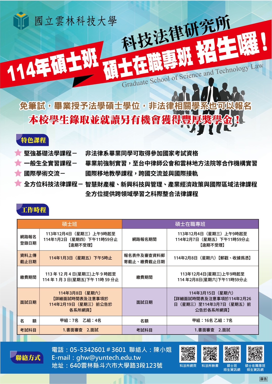 國立雲林科技大學法科技法律研究所114學年度碩士班、碩士在職專班入學招生,敬請踴躍報考。