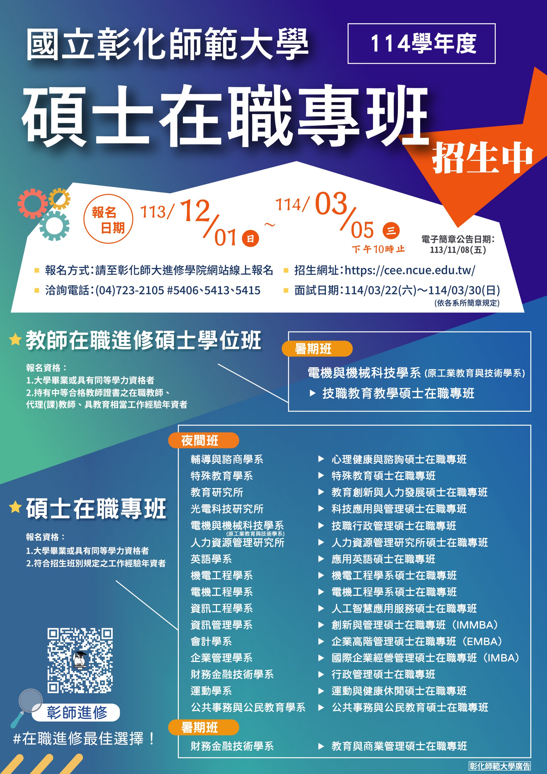國立彰化師範大學「114學年度碩士在職專班」招生,敬請踴躍報考。