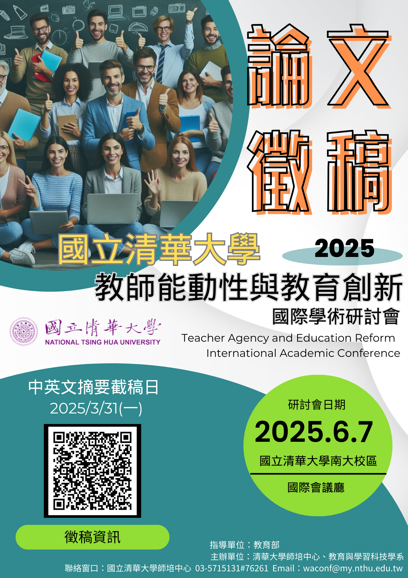 國立清華大學師資培育中心訂於114年6月7日(六)辦理「教師能動性與教育改革」國際學術研討會,即刻起廣大徵稿中。
