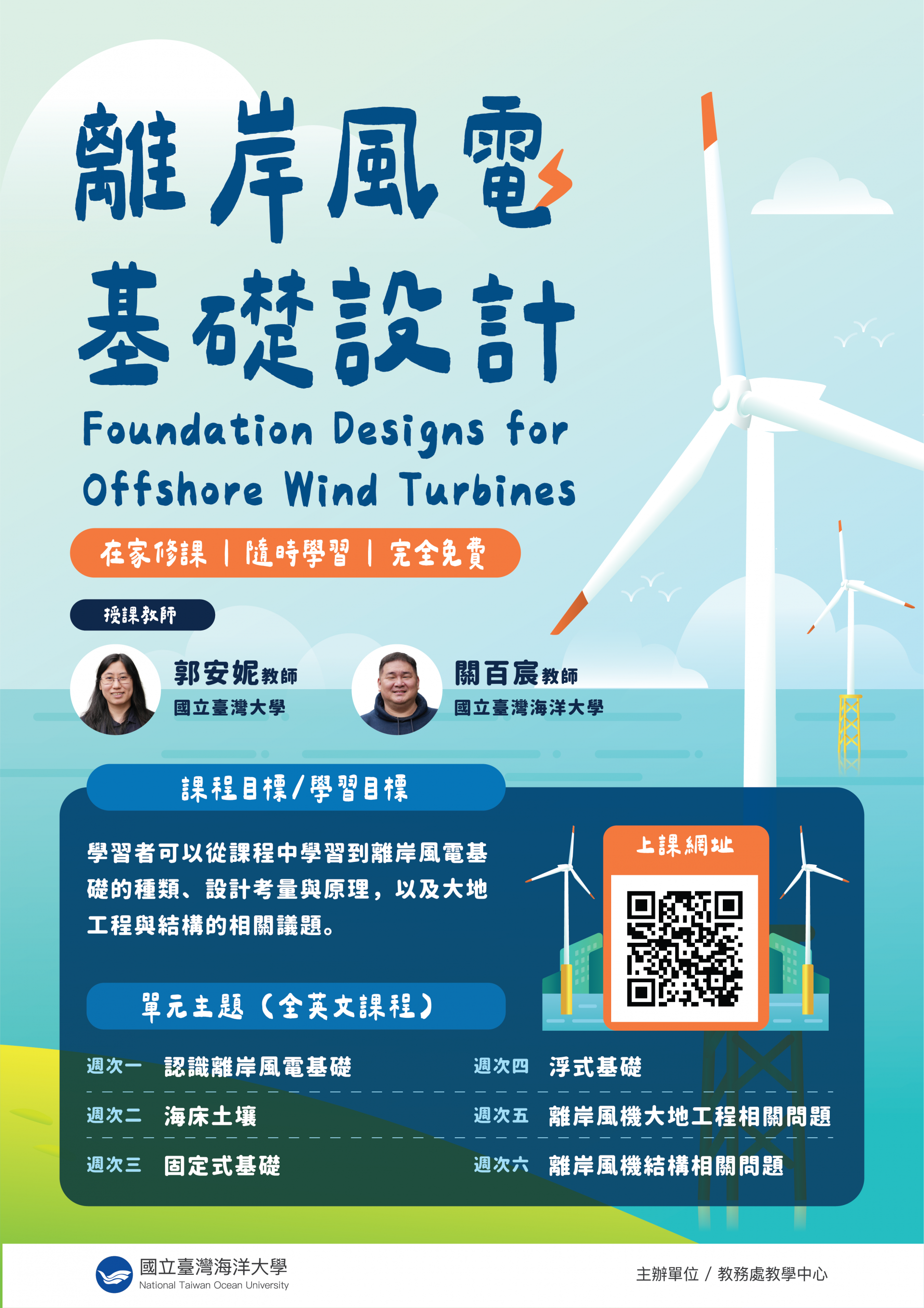 二、為促進綠能發展,因應全球能源轉型趨勢,國立臺灣海洋大學開設「離岸風電基礎設計」線上課程,希望提升學員對離岸風電基礎知識的理解,協助推動環境永續與綠能教育。