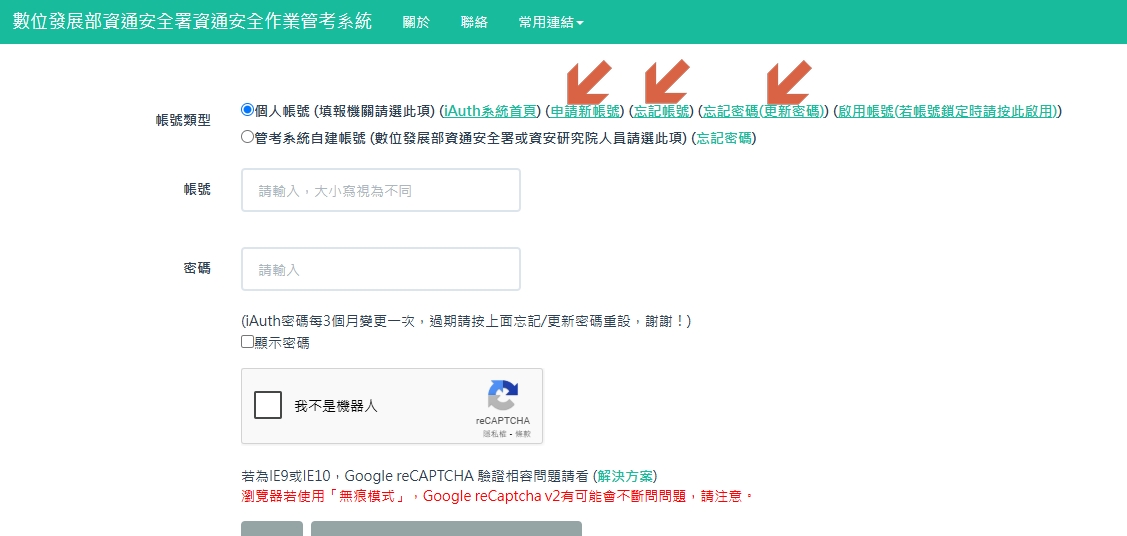 - 本案填報作業需請各校指定並申請學校管理者,經數位發展部資通安全署審查後核配,再由各校管理者審配機關內一般使用者之帳號申請與權限。倘貴校尚無管理者帳號,請依附件 2「管考系統帳號申請手冊」提出申請。