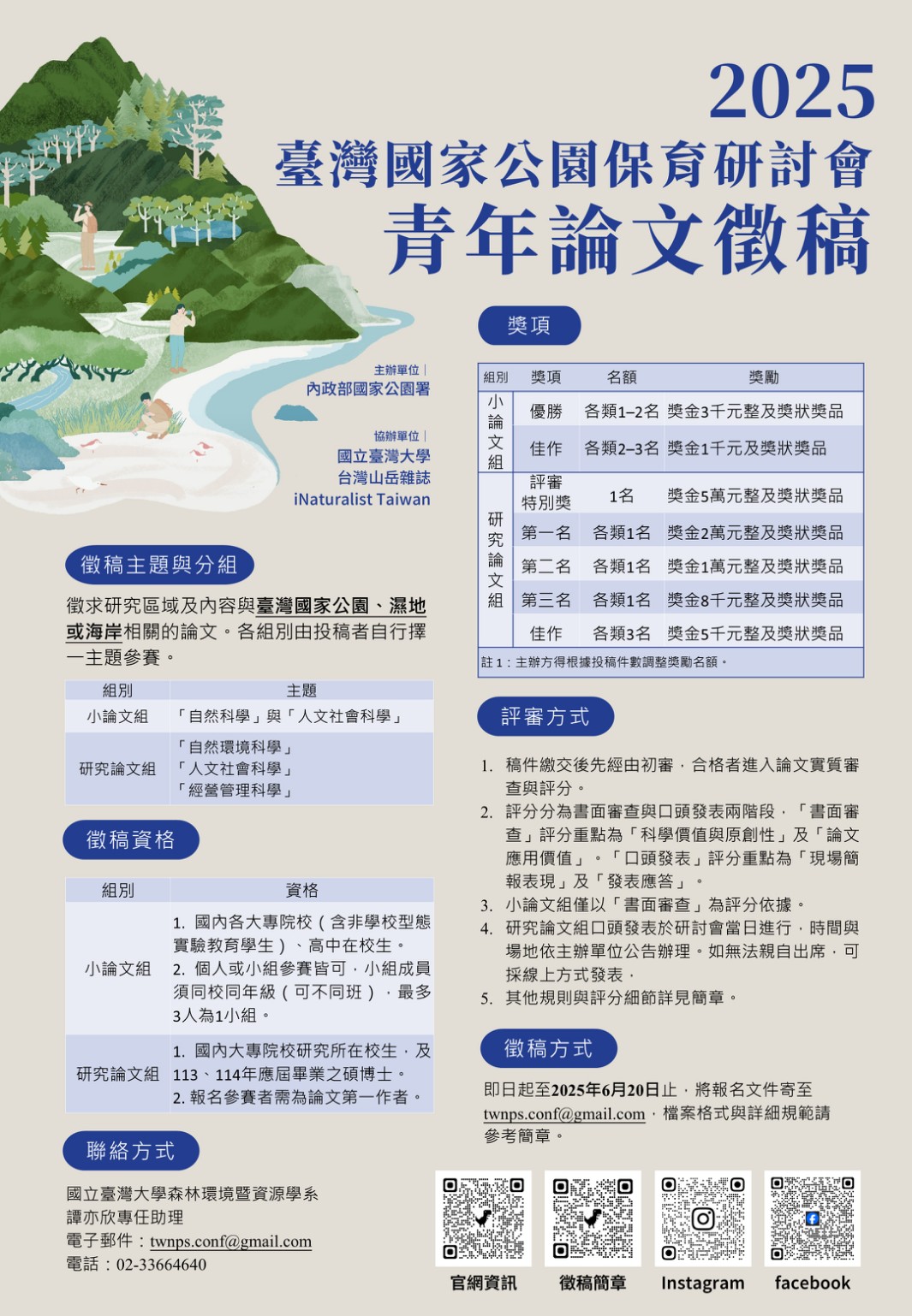二、該署為推動年輕世代關心並參與國家公園相關之保育及經營管理,鼓勵創新思維,培育資源保育研究人才與專業,委託國立臺灣大學舉辦「2025 年臺灣國家公園保育研討會 青年論文徵文競賽」。