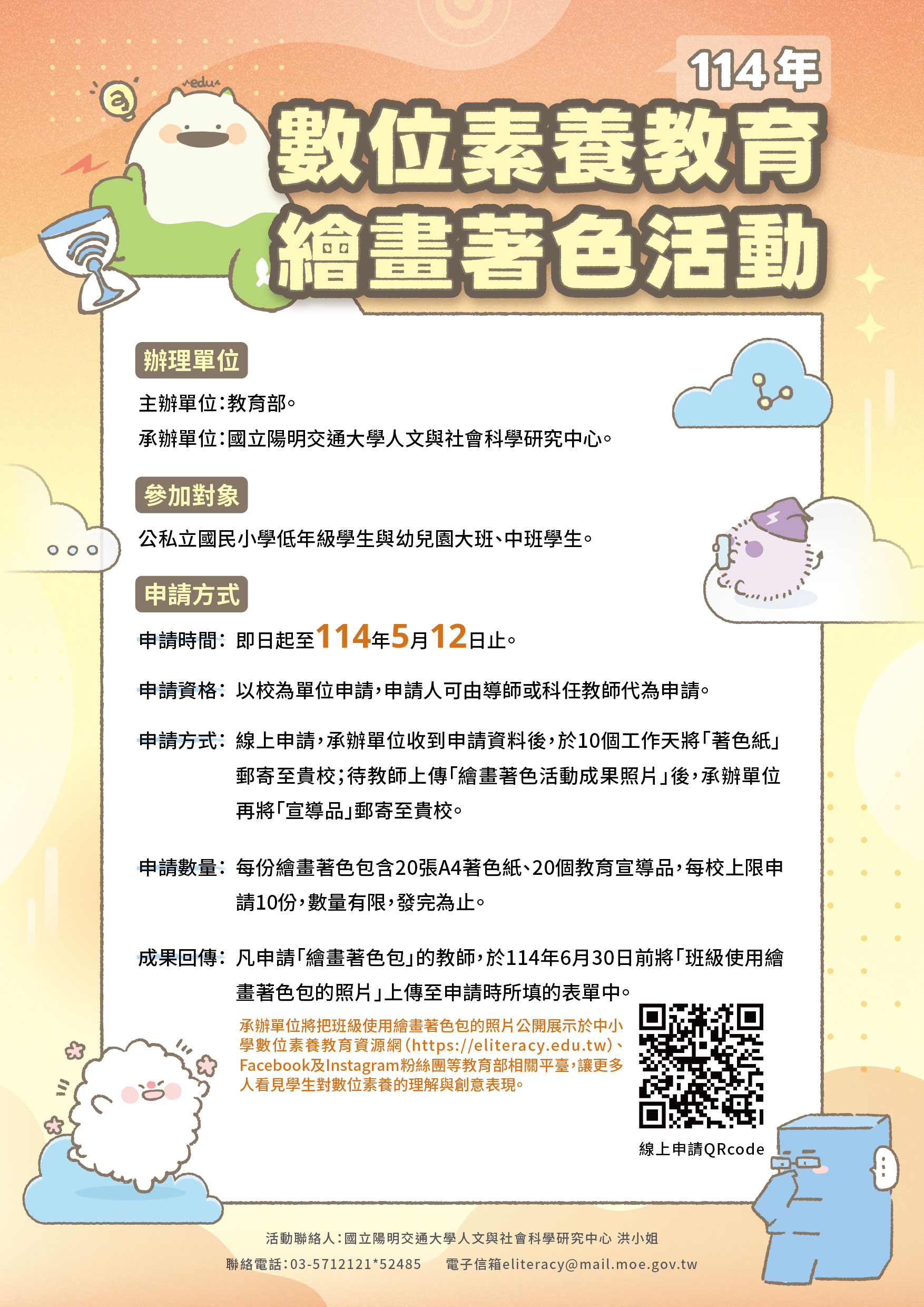 二、為增加國民小學與幼兒園學生對於數位素養的認知,以培養合宜的網路使用態度及習慣,故辦理本繪畫著色活動。