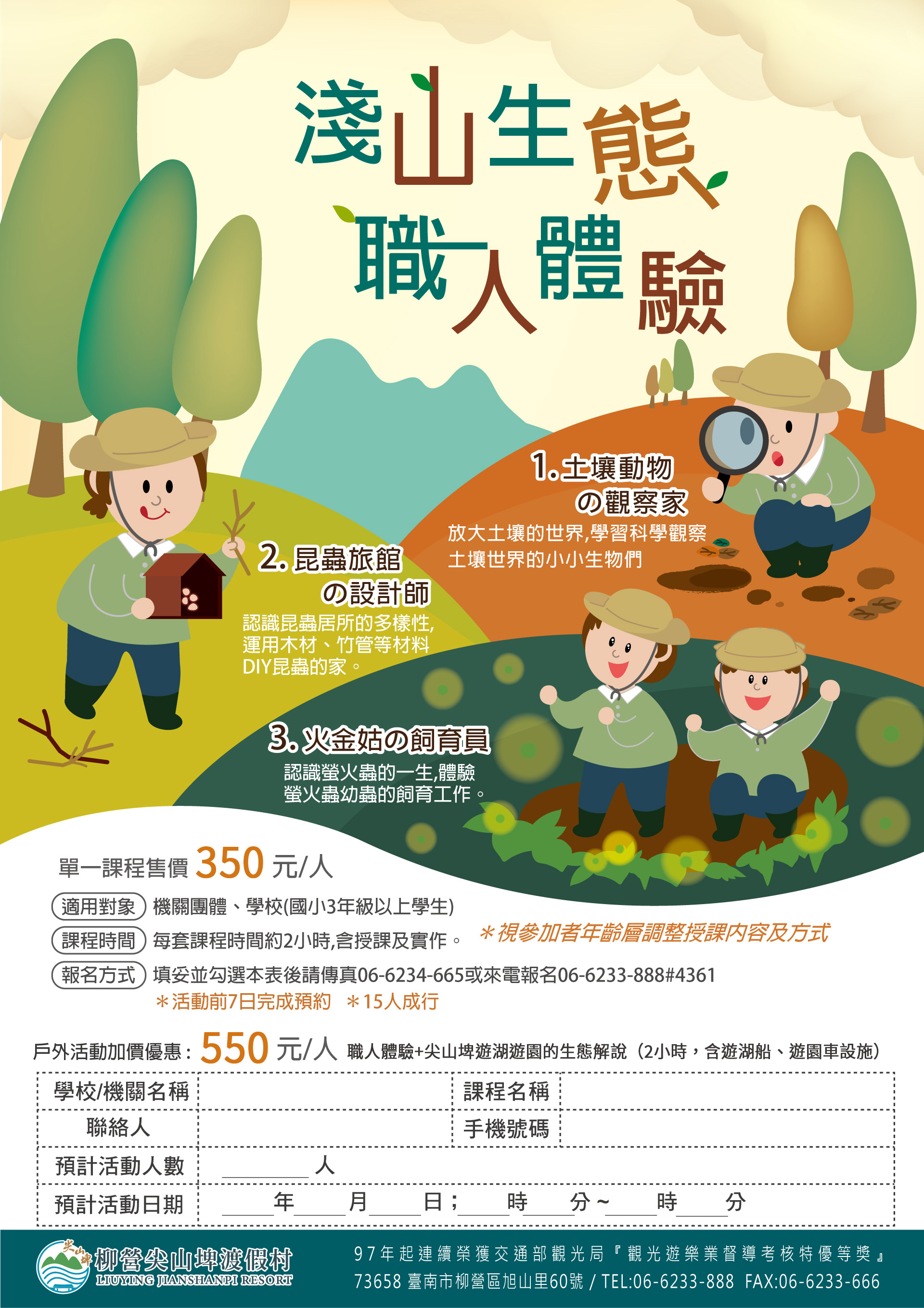 六、所有課程與活動皆採預約制,歡迎有興趣之單位或個人洽詢預約,活動最新資訊亦可參閱「尖山埤環境學習中心」Facebook 粉絲專頁。如有任何問題,敬請聯絡該渡假村,聯絡電話:(06)623-3888 分機 4000 。