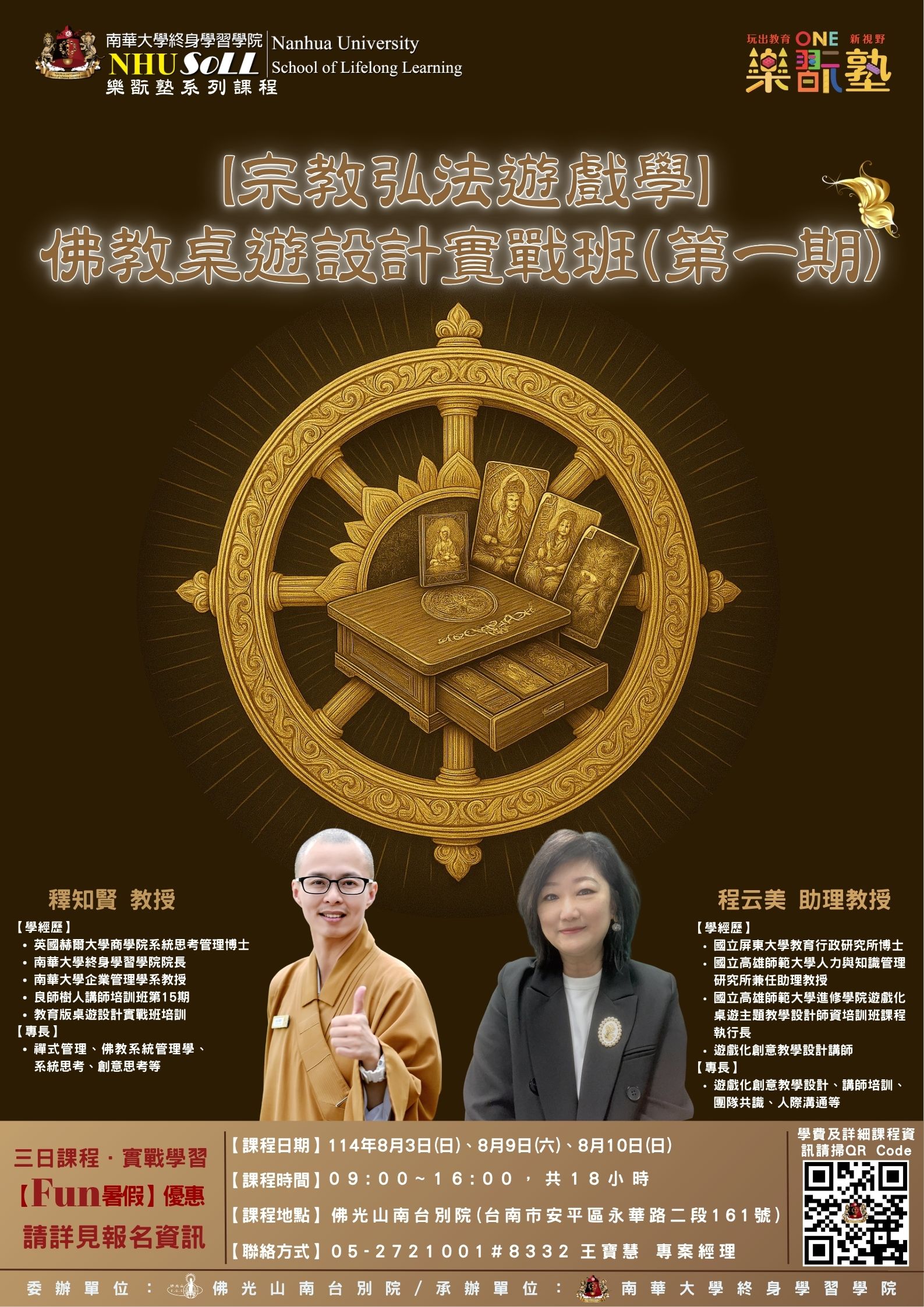 (三)希望培育有意投入桌遊教學場域之學習者,提升桌遊教學所應具備之知識與技能。透過遊戲設計演練創新弘法方式,可以輕鬆學習佛法,探索佛教的不同面向。