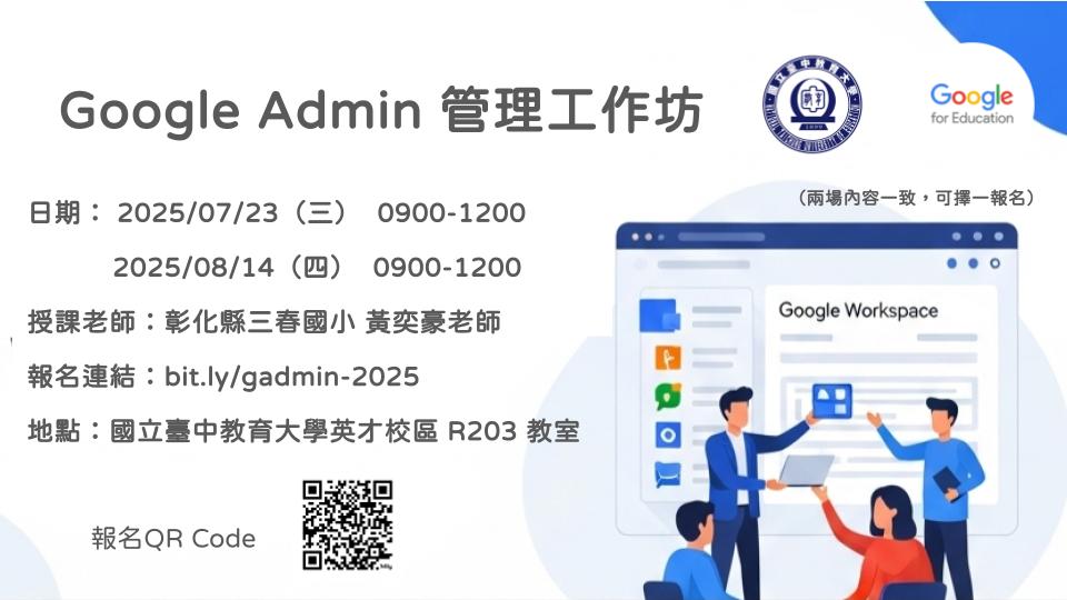 三、隨文檢附課程海報,請於 7 月 10 日(星期四)前完成線上報名,報名網址: bit.ly/gadmin-2025 。