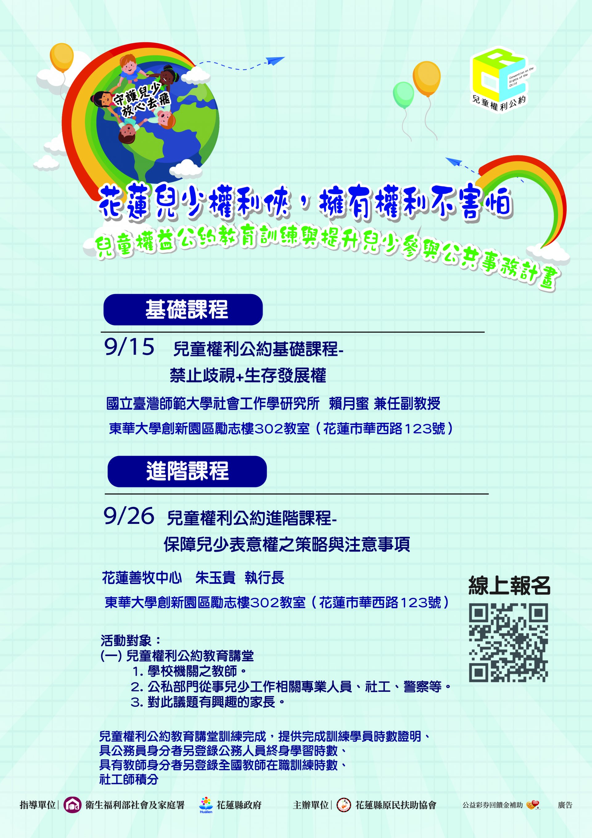 轉知花蓮縣原民扶助協會辦理「衛生福利部-『「花蓮兒少權利俠,擁有權利不害怕」兒童權利公約教育訓練與提升兒少參與公共事務計畫-CRC講堂」報名資訊,請查照。