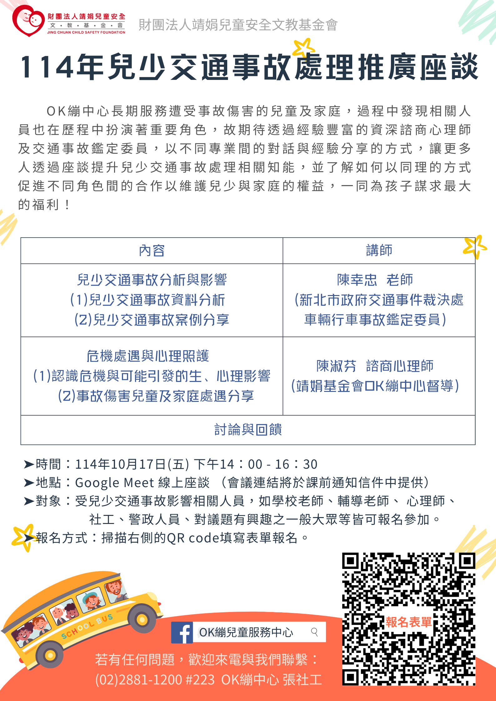 二、財團法人靖娟兒童安全文教基金會將於114年10月17日(星期五)辦理兒少交通事故處理推廣座談,期待透過對話方式從交通、心理、社會等角度分享中心協助處理交通事故的服務經驗傳達給更多相關工作者,讓不同專業之間以同理的態度更了解彼此,一同協助為孩子謀取最大的利益,惠請各校鼓勵同仁參與。