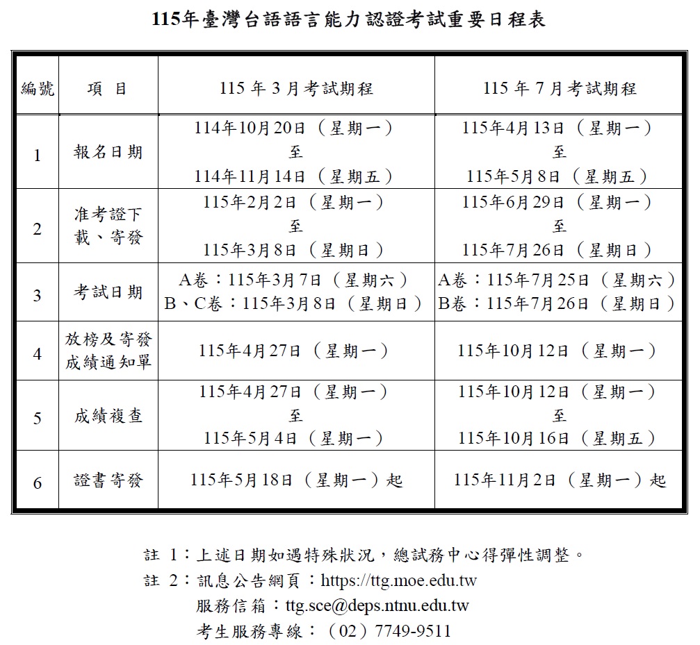 二、為鼓勵全民學習臺灣台語,並加強教師專業素養及學生本土語言能力,特舉辦旨揭認證考試。 115 年預計於 3 月及 7 月共計辦理 2 次考試,詳情請見考試官網(https://ttg.moe.edu.tw)之最新消息「115 年臺灣台語語言能力認證考試重要日程表」(詳附件圖檔)。