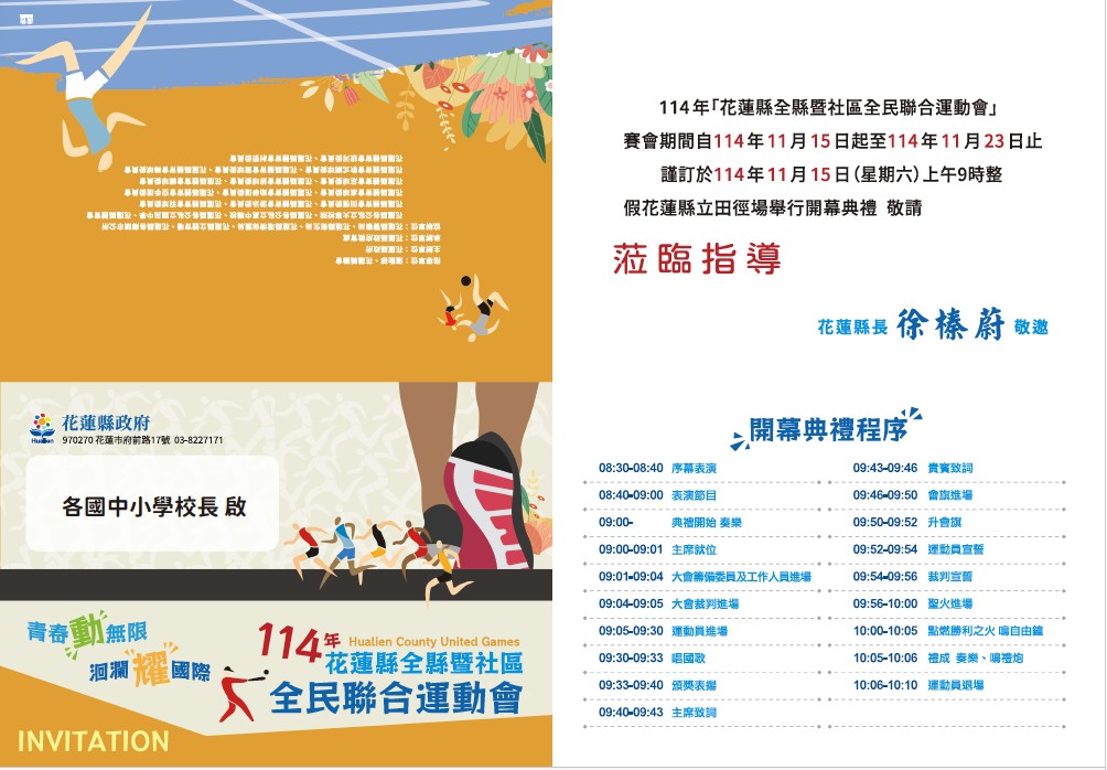 敬邀各國中小校長蒞臨114年全縣暨社區全民聯合運動會開幕典禮,訂於11/15(星期六)上午9點假縣立田徑場舉行,請於上午8時20分於花蓮縣立田徑場南側入口集結,與工作人員一同進場,並請上司令台旁看台觀禮。