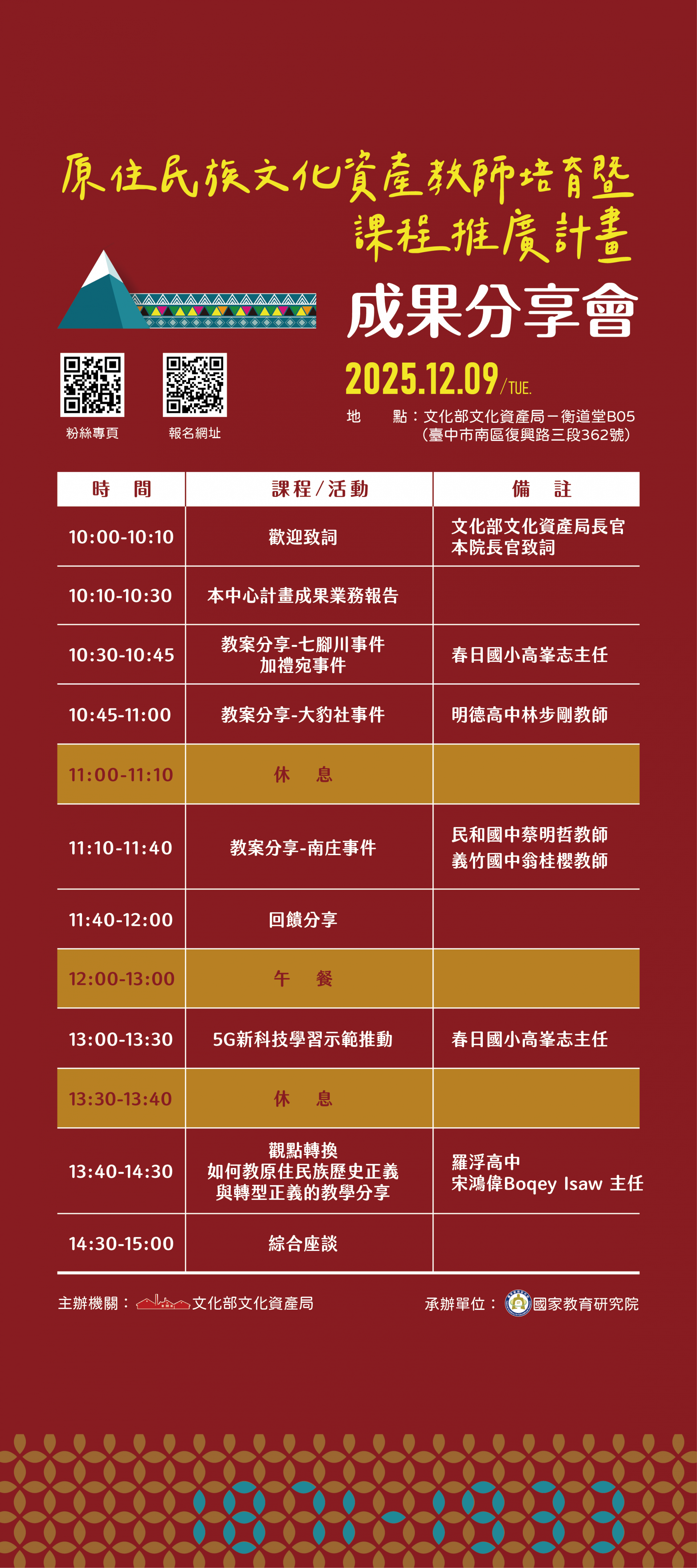 有關國家教育研究院(下稱國教院)辦理「原住民族文化資產教師培育暨推廣課程計畫」成果分享會,敬請各校踴躍報名參加,並依權責准予所屬人員公(差)假相關事宜,請查照。